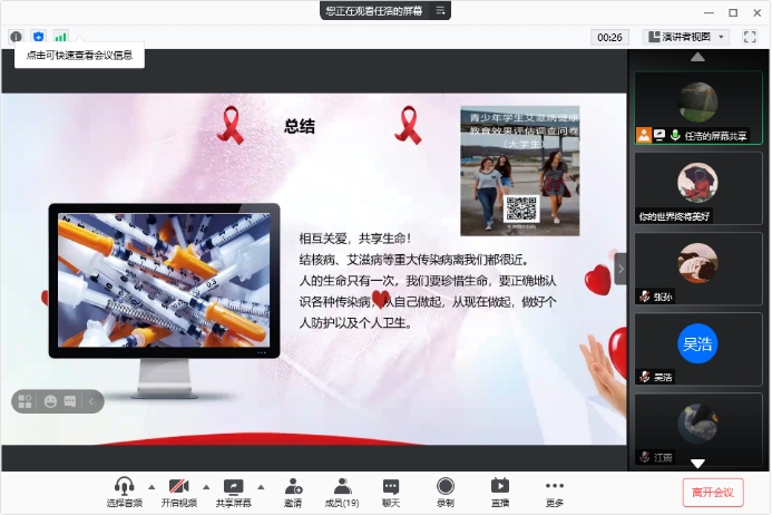 自此,本次“预防艾滋病与结核病等重大传染病”主题班会顺利结束,5班的每一位同学都在本次班会中受益匪浅,并表示在新冠疫情的大背景下我们每个人更应该做好个人以及周边环境的清洁卫生,尤其是在做科研实验时,应及时保持实验室通风。