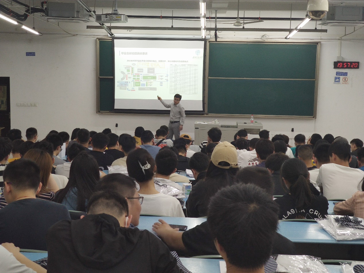 会议第二项,黄德明老师和许欢老师介绍了拍毕业照的相关事项。黄德明老师对拍照的时间和地点进行了再次强调,要求同学们准时到场进行准备,针对服装、拍摄顺序、拍摄安排以及拍摄站位的相关要求进行了详细说明;两位老师对同学们的班级和个人拍摄提出了建议,并鼓励大家主动邀请辅导员和老师参与到拍摄活动中,以留下美好且珍贵的回忆。
