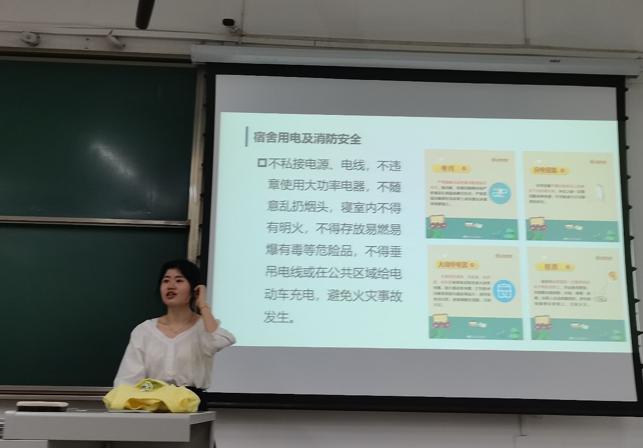 大会第一项,辅导员代宇欣进行宿舍安全教育。代宇欣老师带领同学们再次学习《西南交通大学本科生管理规章制度汇编》中学生公寓管理办法,强调切勿使用或存放违章电器,再次跟同学们厘清了违章电器范围。其次对于宿舍乱拉乱接、插座空插、饲养宠物等事宜进行说明,希望同学们能够对自己和他人的生命财产安全负责,防患于未然。