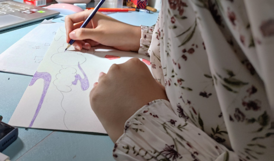 接下来,团支部副书记赵雅雯开始进行手抄报绘画工作,手抄报整体以中秋为元素,圆月、灯笼等元素巧妙映衬了主题,色彩丰富,画风清新可爱,包括素描、勾边、上色、绘字等步骤,历时两天。
