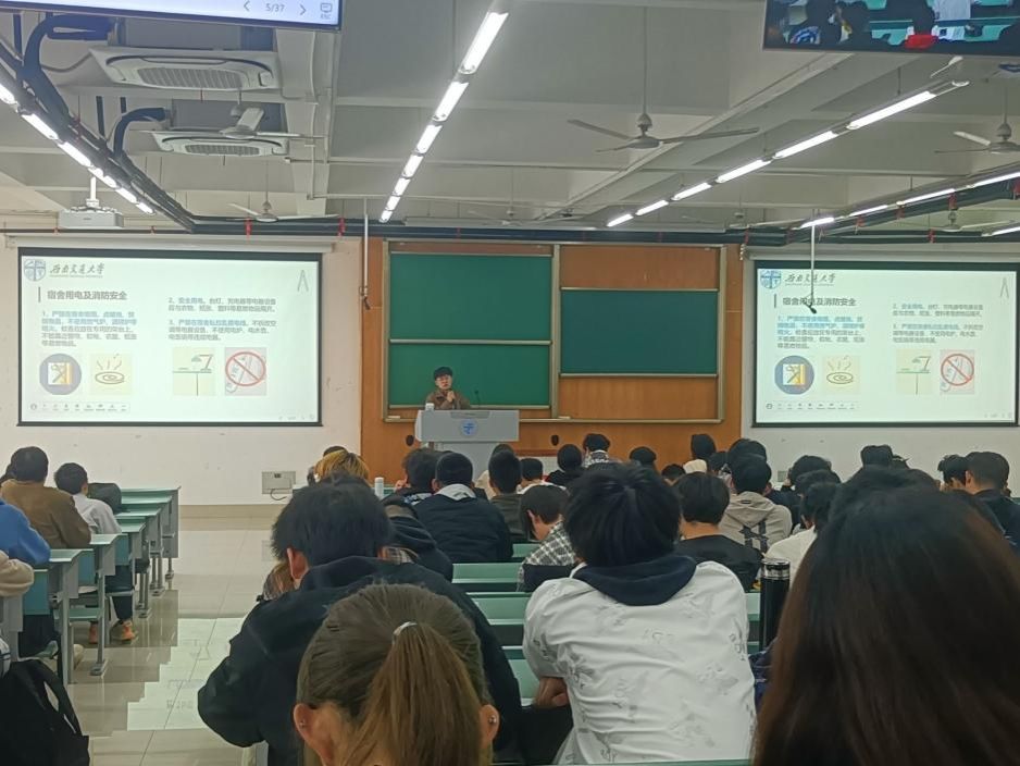 第二部分,年级助理张岩松学长为同学们讲解宿舍安全问题。张岩松首先带领同学们学习《学生公寓管理办法》,分享了近期发生在学生宿舍的消防安全实例,再次强调严禁在宿舍吸烟、点燃明火、安全用电、严禁私拉乱接电线,及时清理宿舍的废旧纸张、衣物、塑料等可燃杂物。随后讲解了关于规范校内电动车停放及充电的通告以及电动车安全使用指南。