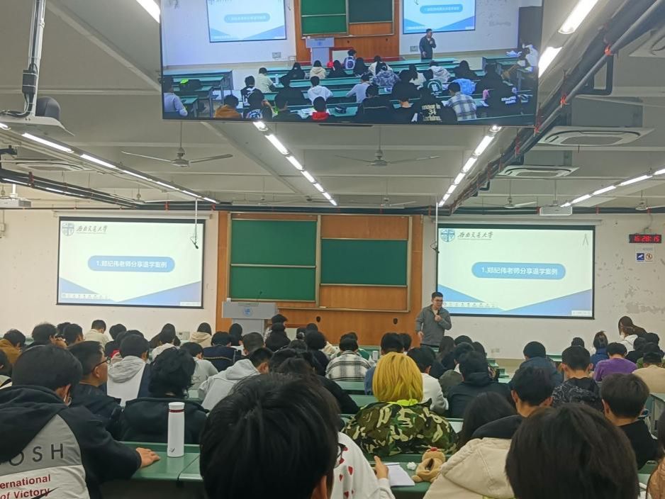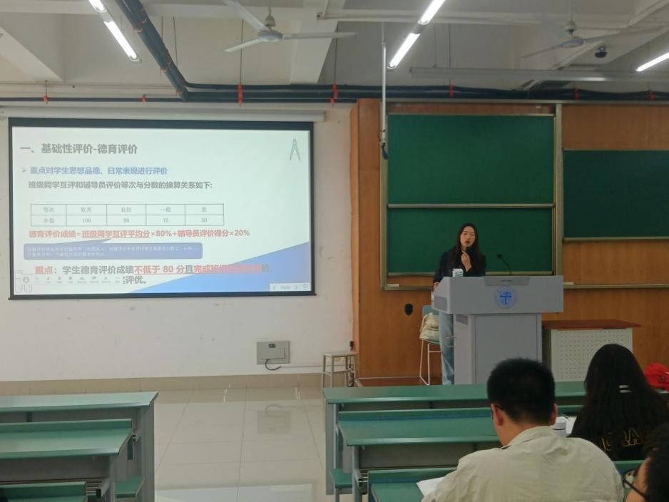 第三部分,年级助理向思林学姐带领同学们学习《西南交通大学本科生综合素质评价办法》。综合成绩由基础性评价和发展性评价构成,其中基础性评价包括德育评价、智育评价、体育评价、美育评价和劳育评价,发展性评价包含学生干部加分、科创竞赛加分等。综合素质评价排名关乎评奖评优,向思林学姐鼓励大家努力学习,认真做好学业规划,以优异的成绩来为自己的大学生活争光添彩。