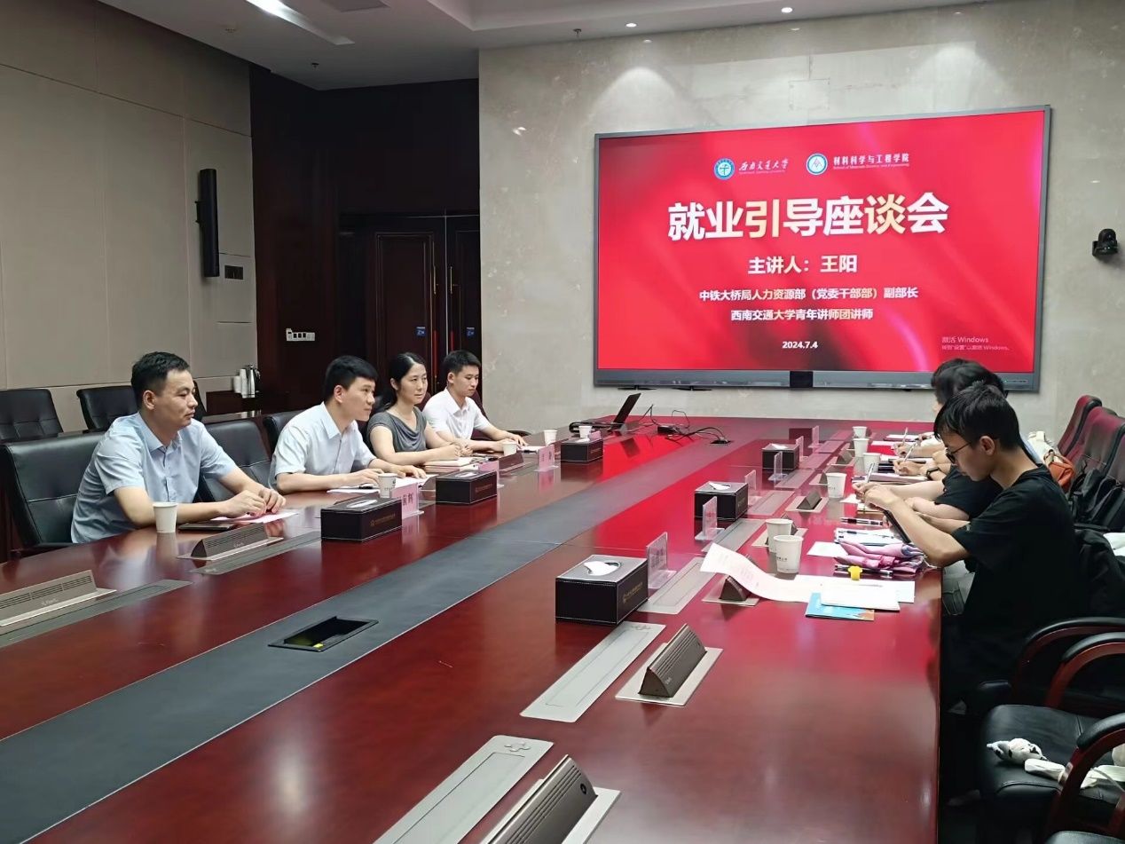 7月4日,西南交通大学材料学院“同心育人”校企对接暑期三下乡实践队——“材绘大桥,智启未来”赴武汉中铁大桥局进行走访调研。中铁大桥局人力资源(党委干干部)副部长、西南交通大学青年讲师团讲师王阳主讲就业引导座谈会。武汉中铁大桥局人力资源部吕静、彭前辉、王吉,学院辅导员、实践队指导老师张琬祺参会。