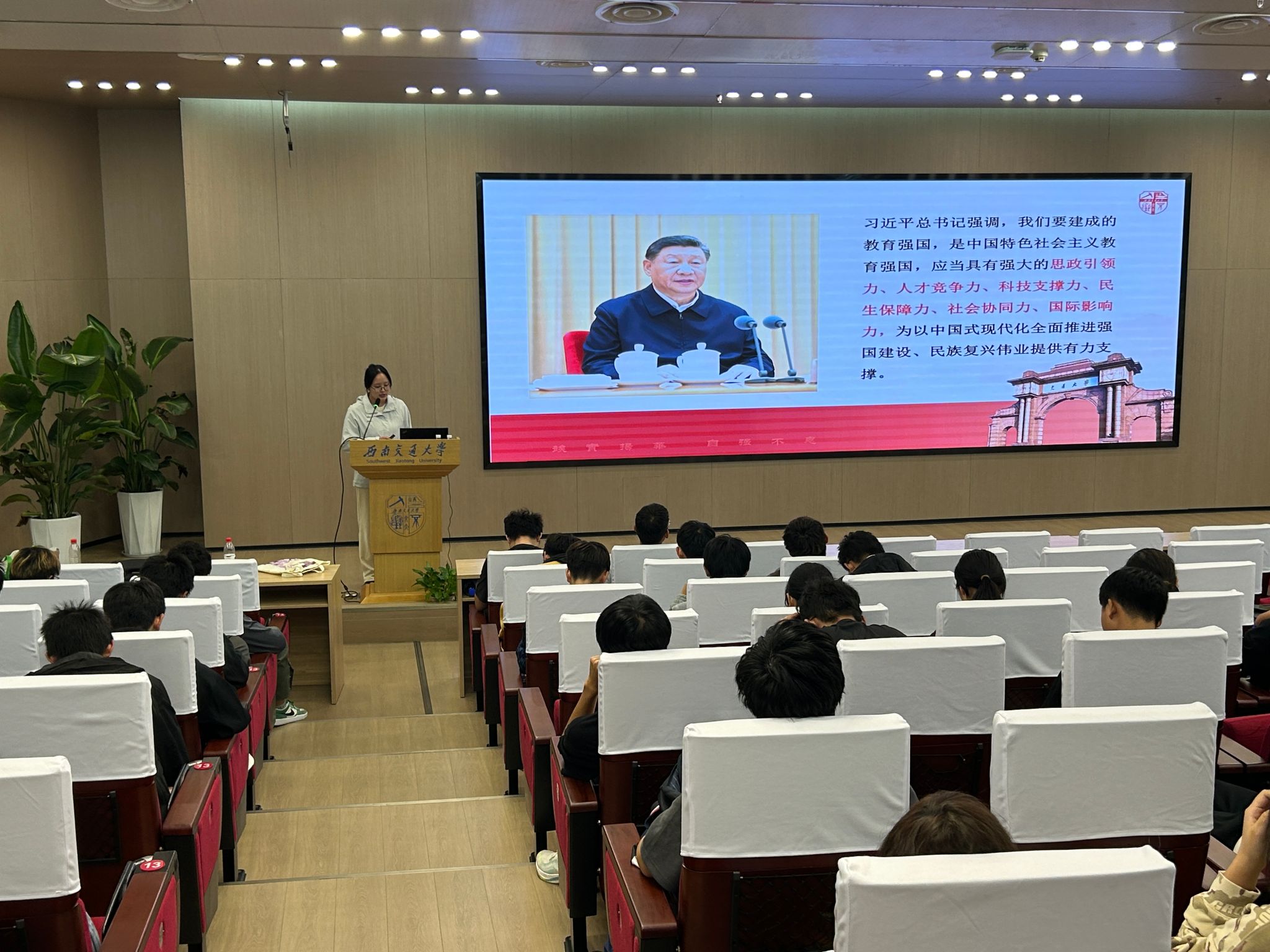 10月24日,在学院团委组织下,材料学院2024级全体新生在图书馆一号报告厅学习全国教育大会精神。材料学院2021级辅导员、学校青年讲师团成员张琬祺领学。