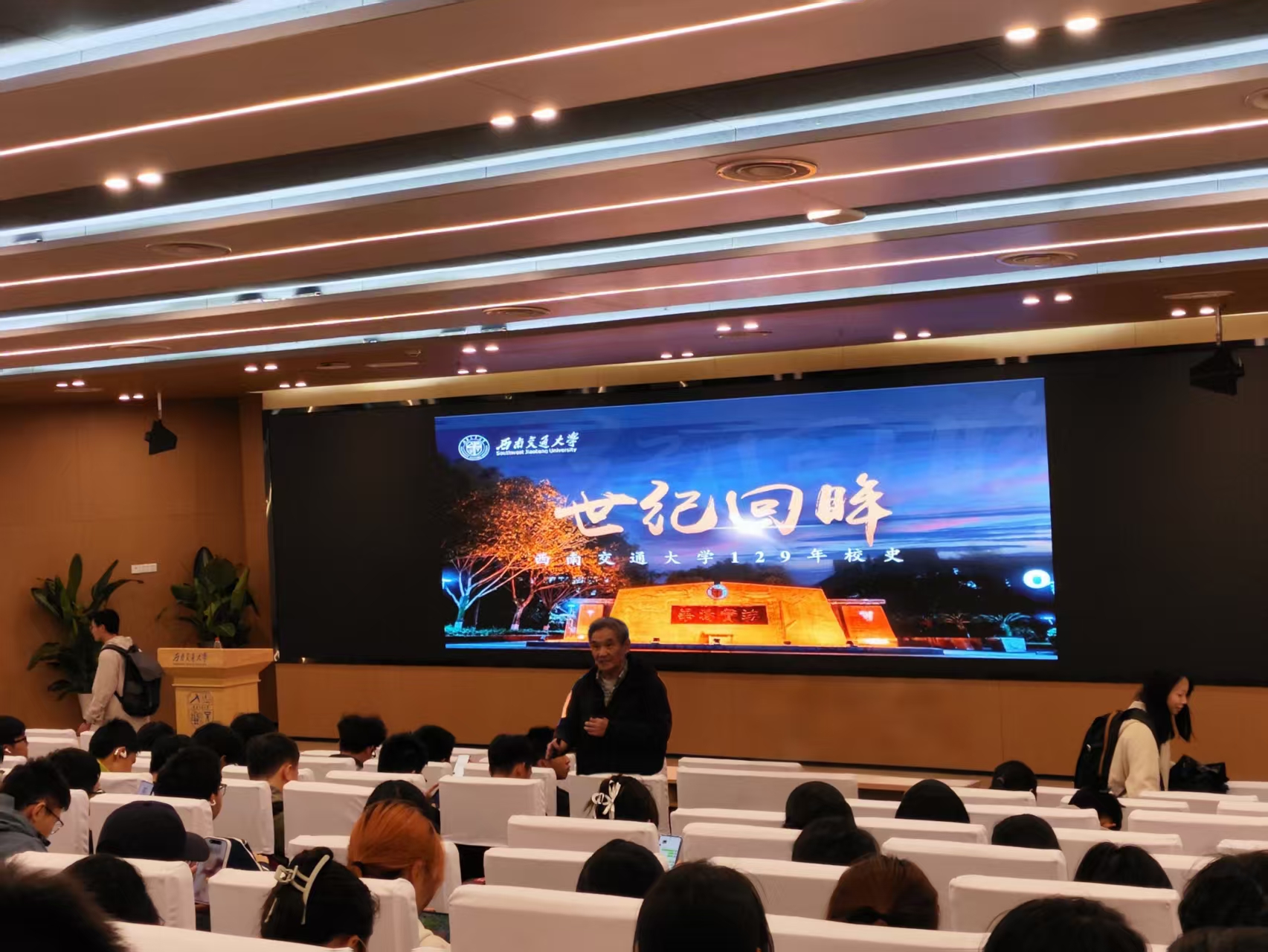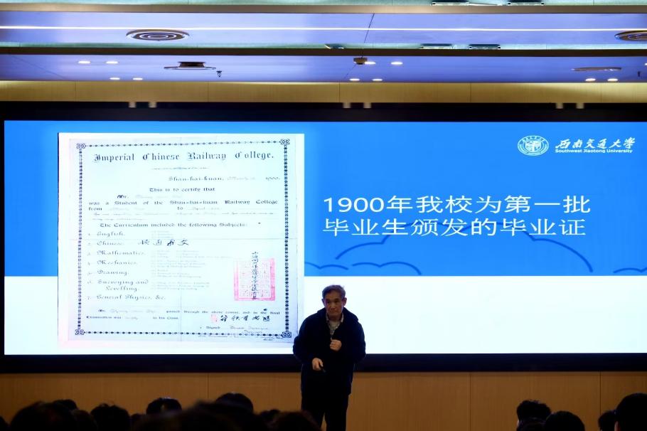 梁教授以“从岁月中走来,向未来走去”为主题,结合珍贵的校史照片、文献资料和亲身经历,生动讲述了学校自1896年创办以来的关键发展节点。从初创榆山的艰难探索,到扩建犀浦的逐步壮大;从学科专业的迭代升级,到人才培养成果的不断涌现;从优良校风的积淀形成,到百年精魂的传承铸造。一个个鲜活的故事、一组组翔实的数据,“竢实扬华,自强不息”的精神熠熠生辉,让在场学生深刻感受到学校一百二十九载的厚重底蕴与奋斗精神。