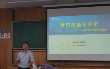 大会第一项,章春军发表讲话。并基于材料学院往年深造数据对考研形势进行了分析。他对2018级的同学提出一些建议,希望同学们可以早日确定自己的目标,比如理想的学校,并为之坚持不懈地奋斗。告诫同学们切忌走马观花,在考研时不要一味追求名校,要找到适合自己情况的更重要。