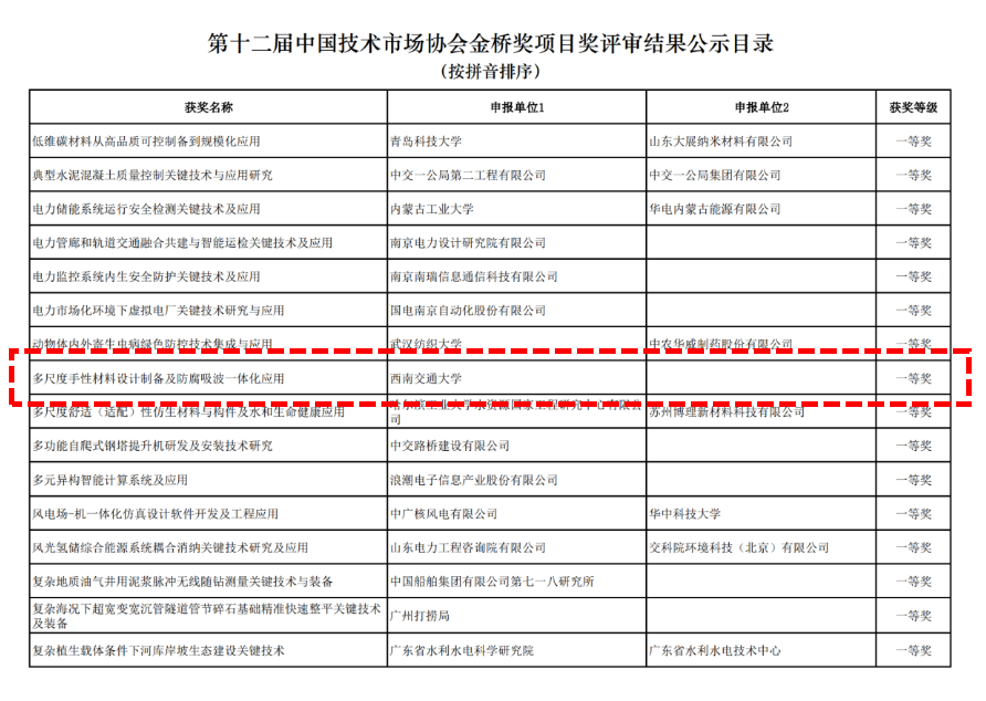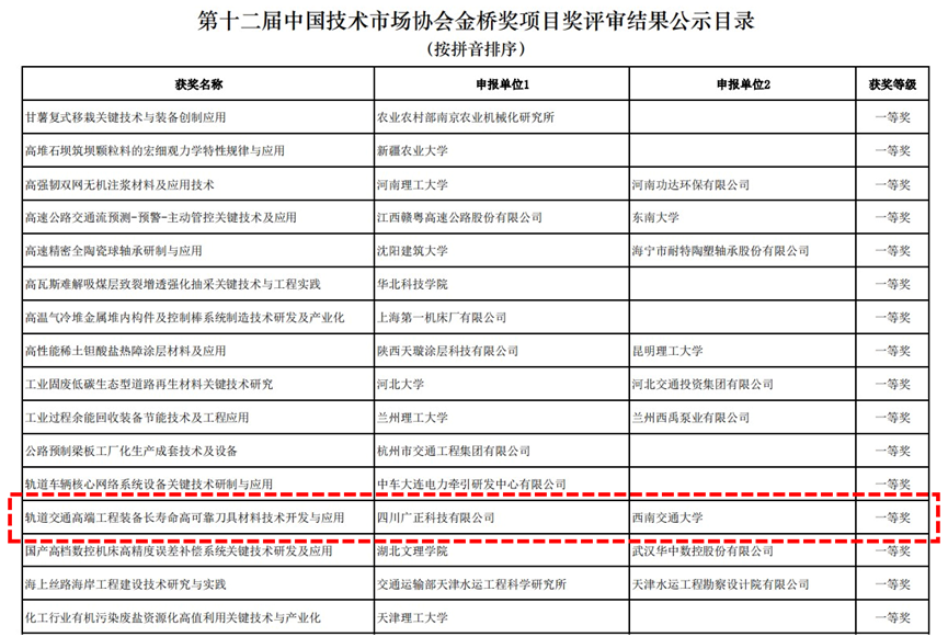 近日,中国技术市场协会公示了第十二届中国技术市场协会金桥奖评审结果,我院陈辉教授牵头,联合四川广正科技有限公司申报的“轨道交通高端工程装备长寿命高可靠刀具材料技术开发与应用”和孟凡彬教授牵头的“多尺度手性材料设计制备与防腐吸波一体化应用”项目均荣获第十二届中国技术市场金桥奖一等奖。