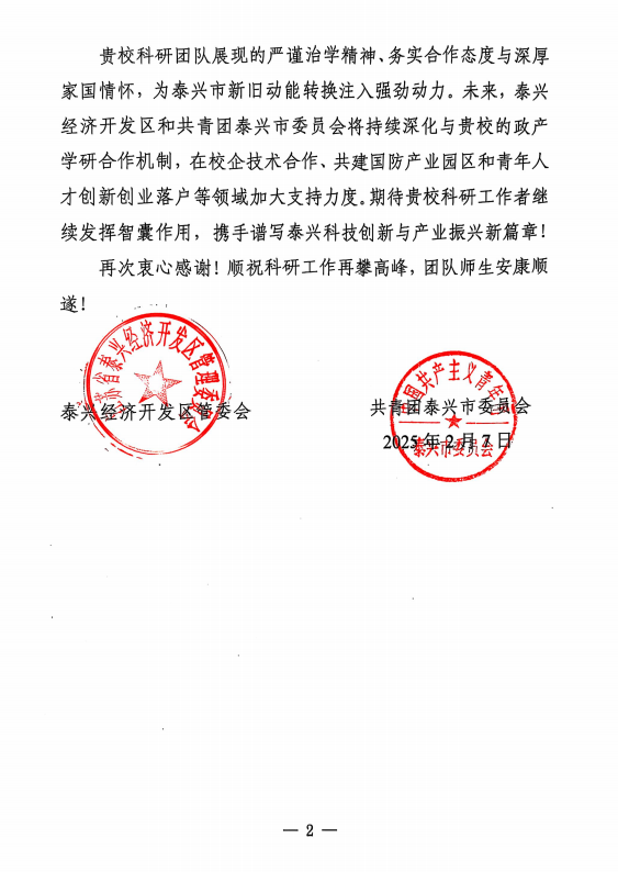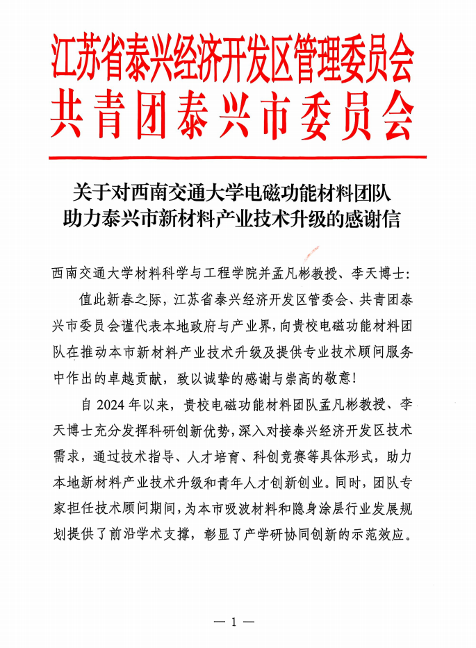 近日,西南交通大学材料学院收到一封来自江苏省泰兴经济开发区和共青团泰兴市委员会的感谢信,对材料科学与工程学院电磁功能材料团队孟凡彬教授、李天博士研究生在泰兴市吸波材料、隐身涂层等新材料军工行业的产业升级、技术指导和青年人才培育等方面作出的卓越贡献表示感谢。