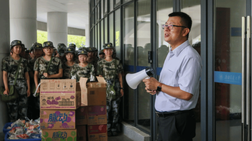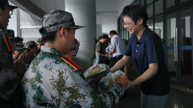 慰问过程中,沈哲、熊钰和新生辅导员们将提前准备好的运动饮料、零食等物资逐一递到新生手中,以实际行动传递学院的关怀。沈哲对新生们在军训中的表现给予肯定,对大家展现出的纪律意识、团队精神与吃苦精神表示称赞。他强调,军训作为大学生涯中不可或缺的“第一课”,不仅是国防教育的重要载体,更是锤炼意志、塑造品格、增强集体荣誉感与责任感的关键契机。他也深情回忆起自己的军训岁月,并说道,“终将成为你们大学生涯中最珍贵、最温暖的一段记忆。”他鼓励同学们珍惜此次军训机会,用心体会过程中的每一份感受,收获真挚的同学情谊,并将军训中养成的优良作风与坚韧品质融入未来的学习和生活中,以更昂扬的姿态迎接大学生活的挑战。随后,一行人还与新生亲切交流,关切询问大家的训练情况、训练感受和生活需求:“感觉怎么样?”“训练强度能接受吗?”一句句关心的话语,让训练场的氛围变得格外温馨。