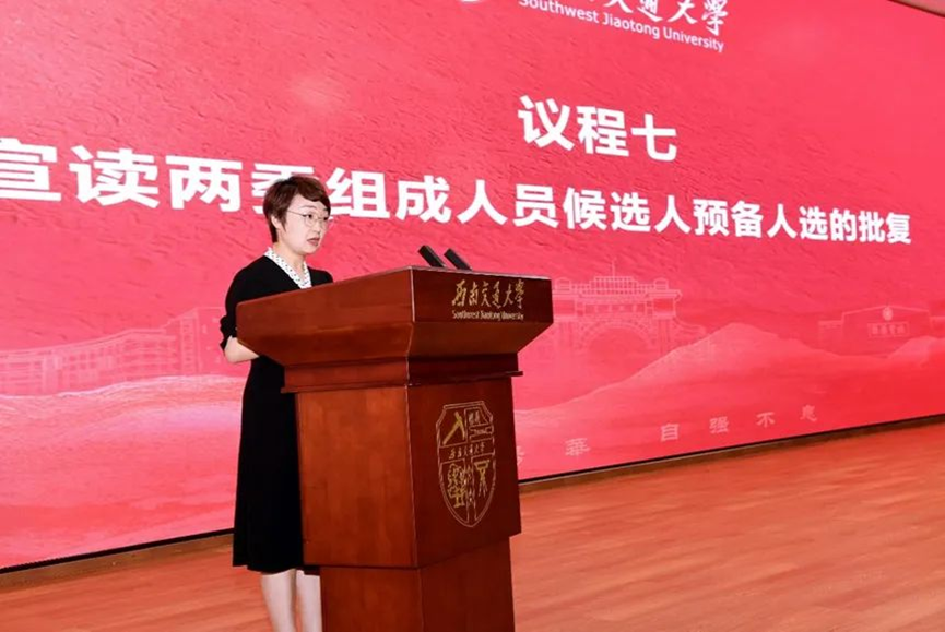 何诣寒代表学校党委宣读了《中共西南交通大学委员会关于同意材料科学与工程学院学院新一届党委和纪委组成人员候选人预备人选的批复》。