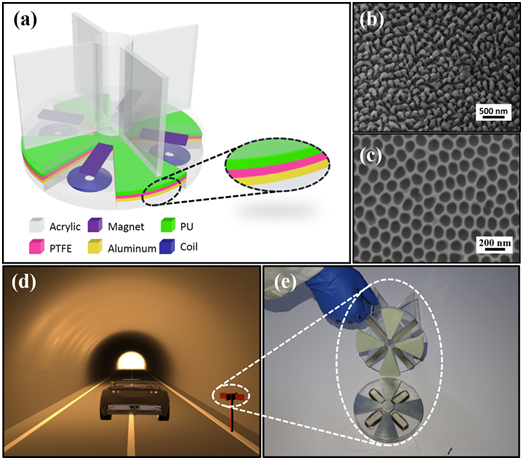 在威廉希尔WilliamHill官方网站材料学院杨维清教授和美国佐治亚理工学院著名科学家王中林院士共同指导下,威廉希尔WilliamHill官方网站15级硕士生张彬彬和美国佐治亚理工学院陈俊博士,发明了一种无源无线车流量监测系统。如图所示,该系统杂化纳米摩擦发电机与微型电磁发电机阵列,巧妙地利用了纳米摩擦发电机的高电压和电磁发电机的强电流各自优点,应用纳米线和纳米孔的表面微结构修饰,复合纳米发电机在负载为700欧姆情况下,能够输出能量密度为55.7 W/m3,为偏远山区的隧道无源无线车流量实时监测系统提供了充足的能源,为高速列车关键部件无源无线安全监测系统的开发利用提供了新的思路和新技术。这是该团队在国际顶尖杂志Advanced Materials(影响因子17.493)和NanoEnergy(影响因子10.325)发表论文以来的又一佳作。