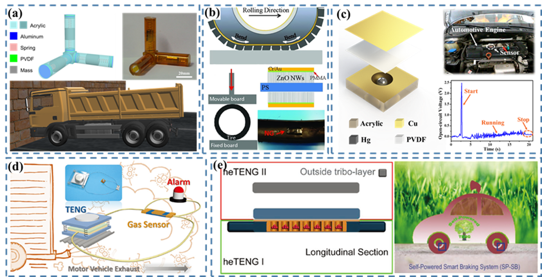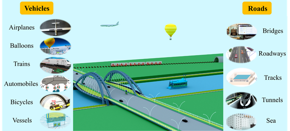 在人类历史上,交通使人类认识世界,促进文化交流,为人类文明发挥着不可或缺的作用。而得益于交通的发展,人类在实际道路与文明道路上都可以走得更远。在现代生活中,尤其是在城市交通网络,智能交通系统(ITS)的出现为了人类的安全和方便提供了更好的保障。传感器作为智能交通系统的基础,广泛用于信号采集。而在整个系统中,只有传感器工作,大数据以及后续处理才能对运输调度起作用,才可以称之为智能化。由于微电子技术的发展,小的传感器具有更低的能源消耗。但是用于传感器的电源(如电池)储存的电能仍然是有限的。并且频繁地替换或重新为电池充电对于数量巨大的分布式传感器是一个巨大的工程。与此同时,废旧电池还会给环境带来很大的影响。而另一方面,传统的电缆电源由于传感器数量的增加,出现了越来越复杂的布线问题。在这方面,自供电技术便显得尤为重要。幸运的是,纳米发电机不仅可以在交通载体运行过程中获取环境能量,为其任意分布的多个传感器供电,还可以作为主动式传感器,实现对智能交通系统的自供电无线监控。