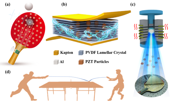 在青年教师邓维礼和杨维清教授的共同指导下(共同通讯作者),材料学院2018级硕士研究生田果通过非溶剂诱导相分离联合高压结晶的两步法研制了一种具有独特富含片晶结构的类千层饼状柔性PZT/PVDF压电复合传感器。利用该独特结构所具有的层间电势累积效应和快速的应力释放,实现了传感器优异的灵敏度 (6.38 mV/N),超快的响应时间 (21 ms),和良好的机械稳定性。并将其集成在乒乓球拍上用于准确检测击球的位点和作用力,进而反馈运动员的状态并为其提供个性化训练指导,展示了巨大的应用前景。同时该成果也在传统视觉监测系统之外为智能体育运动提供了一种全新的监测方式,为智能电子设备开拓了一个新的应用视角。该研究成果以 “Rich Lamellar Crystal Baklava-structured PZT/PVDF Piezoelectric Sensor Toward Individual Table Tennis Training” 为题在线发表在Nano Energy上。(论文链接:https://doi.org/10.1016/j.nanoen.2019.03.013)