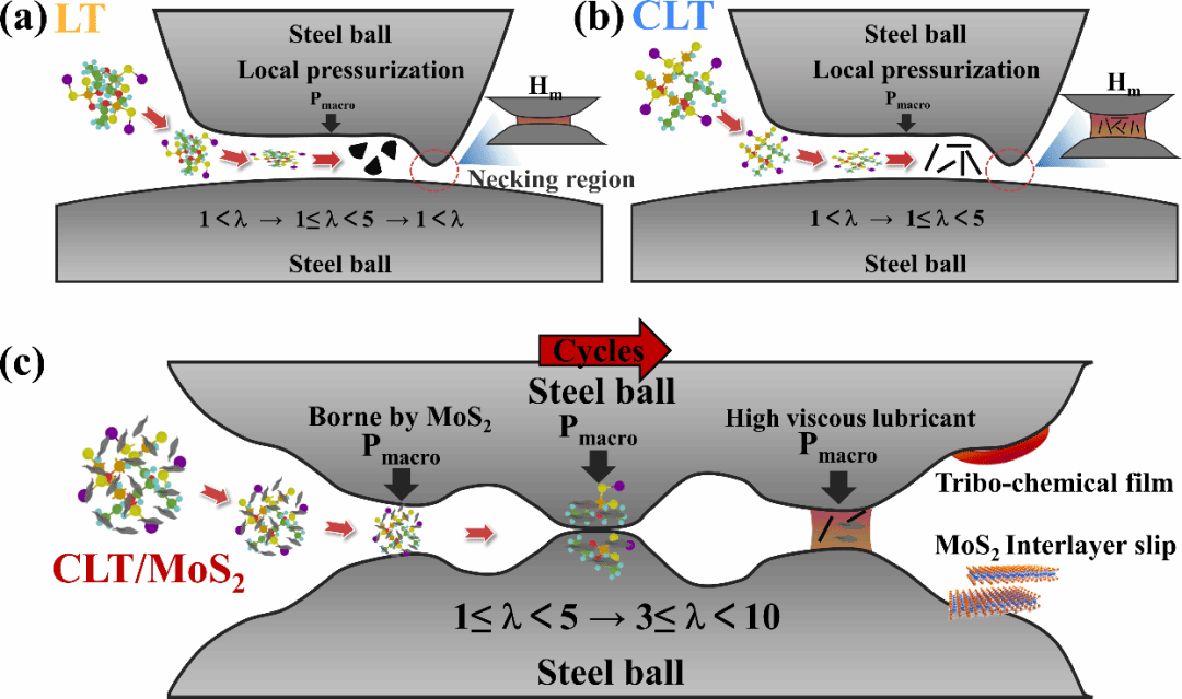 图5 稠化剂作用于摩擦界面的可能场景的示意图:(a) 大块的LT稠化剂在界面的聚合导致了润滑不足效应的产生;(b) CLT细短纤维充分分散于油膜脂中,油膜黏度的提升造成了膜厚的递增;(c) CLT/MoS2全方位减磨抗磨机理