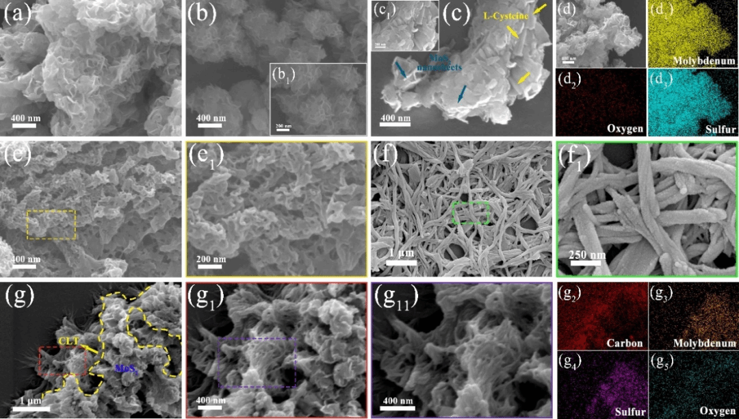 图2 (a, b, b1, d) 原始MoS2和(c, c1) MoS2-NH2的SEM图像,以及Mo、S、O元素的特征面分布;(e, e1) LT和(f, f1) CLT的SEM图像;CLT/MoS2的SEM图像和对应的元素映射图像(g, g1, g11, g2, g3, g4, g5)