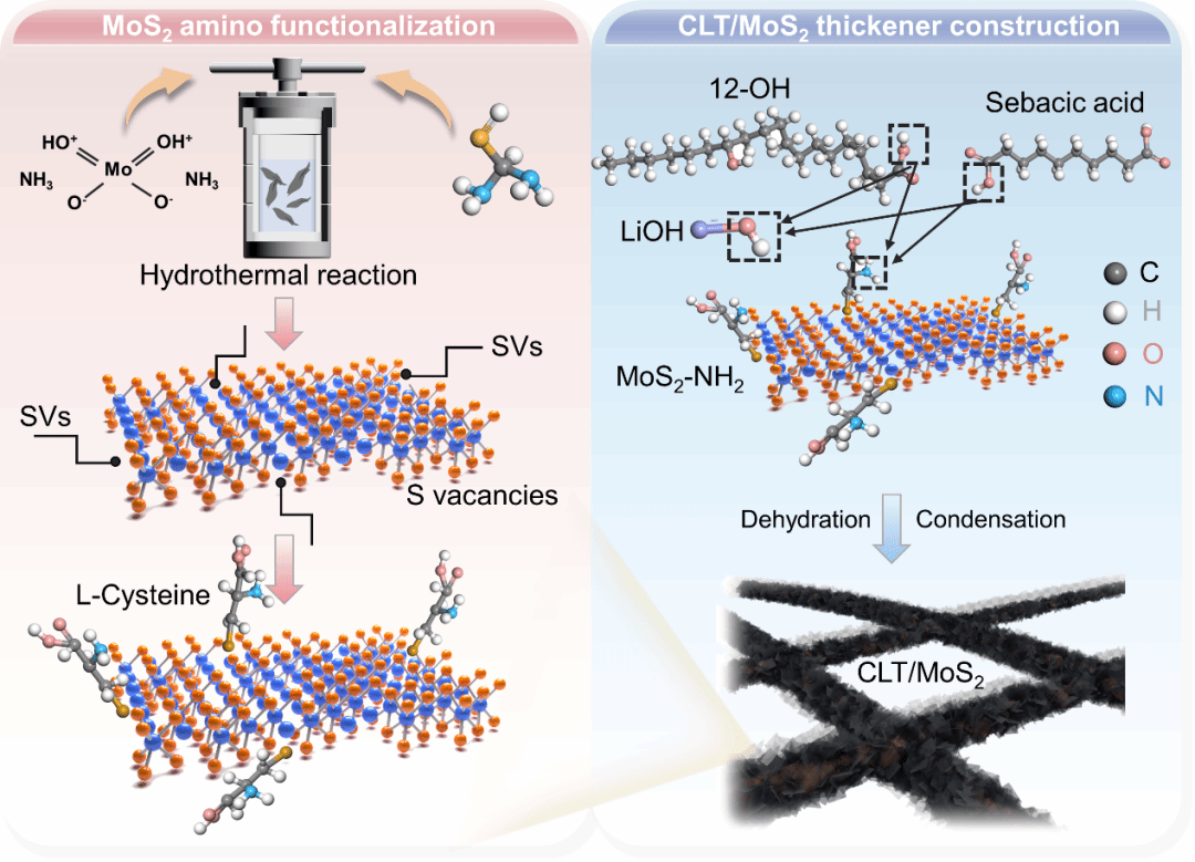 通过原位还原MoS2接枝于凹凸棒制备了功能化的凹凸棒稠化剂(ATP/MoS2),证明了ATP/MoS2稠化剂对润滑脂摩擦学性能的增强作用,并提出了其润滑机理,相关工作发表于专业领域权威期刊Tribology International, 2023, 179, 108135。同时,利用机械应力诱导和硫醇化学导向技术充分利用缺陷S空位和活性Mo原子共轭,成功获得氨基化改性MoS2,并将其引入到皂化过程中,原位构建了一种新型的二硫化钼功能化复合锂皂多元氢键稠化体系,探究了该稠化剂所调制的润滑脂在高剪切速率和长剪切时间下的流变响应行为,揭示了新型稠化剂在摩擦界面二硫化钼的释放规律以及独特纳米结构的摩擦膜形成机制。该文章近日以题为“MoS2 functionalized lithium complex soap with enhanced thickening net structure toward high-performance thickener”发表于国际权威期刊Chemical Engineering Journal, 2023, 478, 147445。
