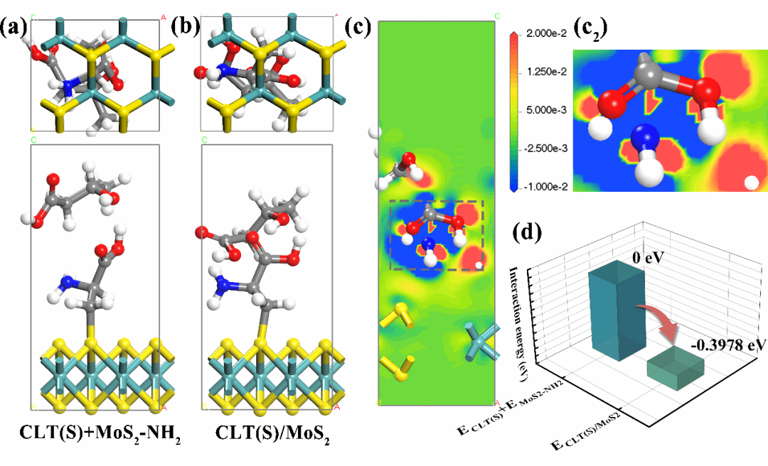 3 (a) CLT(S)+MoS2-NH2相互作用的单位细胞模型;(b) CLT(S)/MoS2的优化晶胞模型;(c) CLT(S)/MoS2的电荷密度切片;(c2)(c)中反应作用位点的局部放大图;(d) 计算出的CLT(S)+MoS2-NH2CLT(S)/MoS2的相互作用能