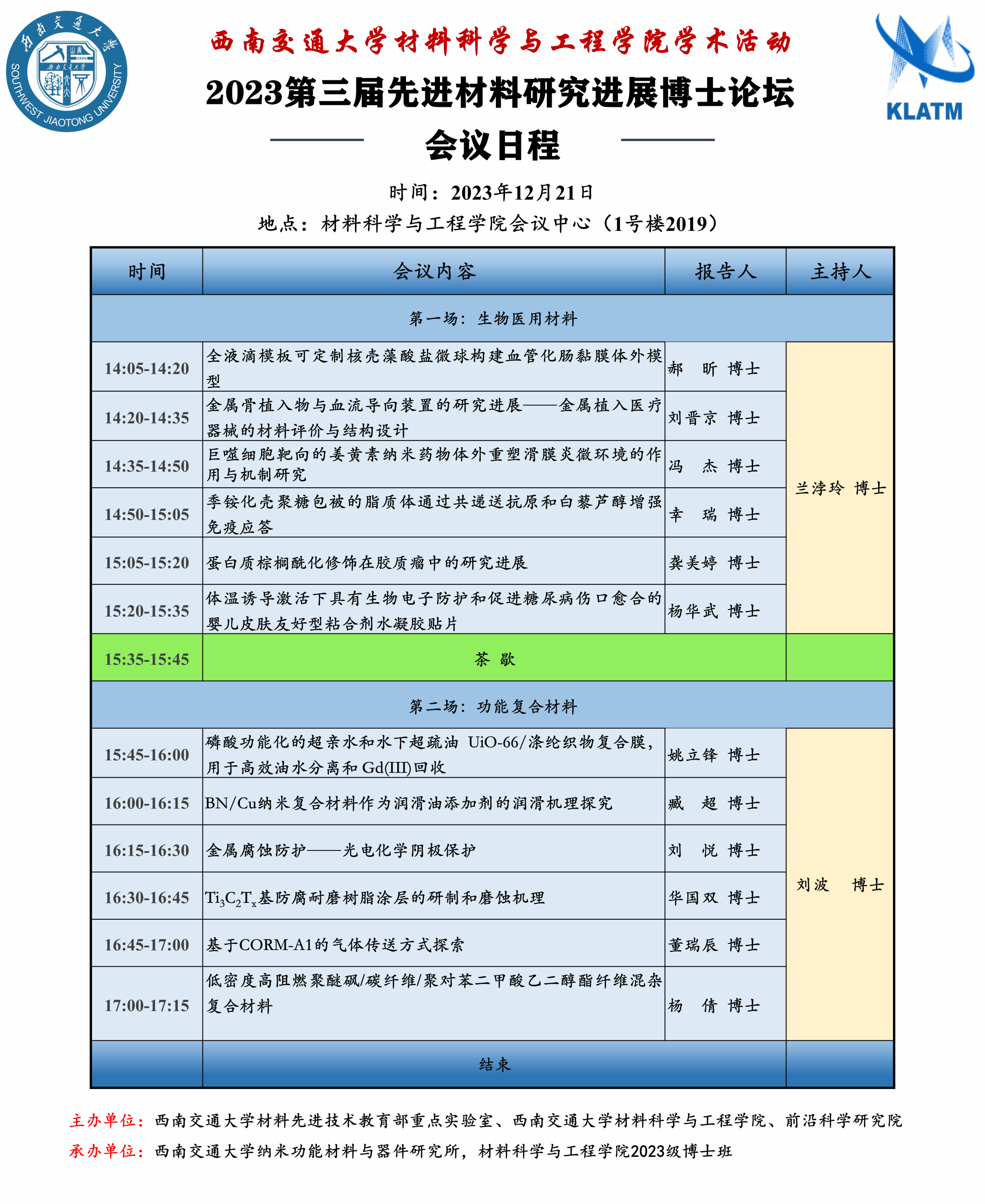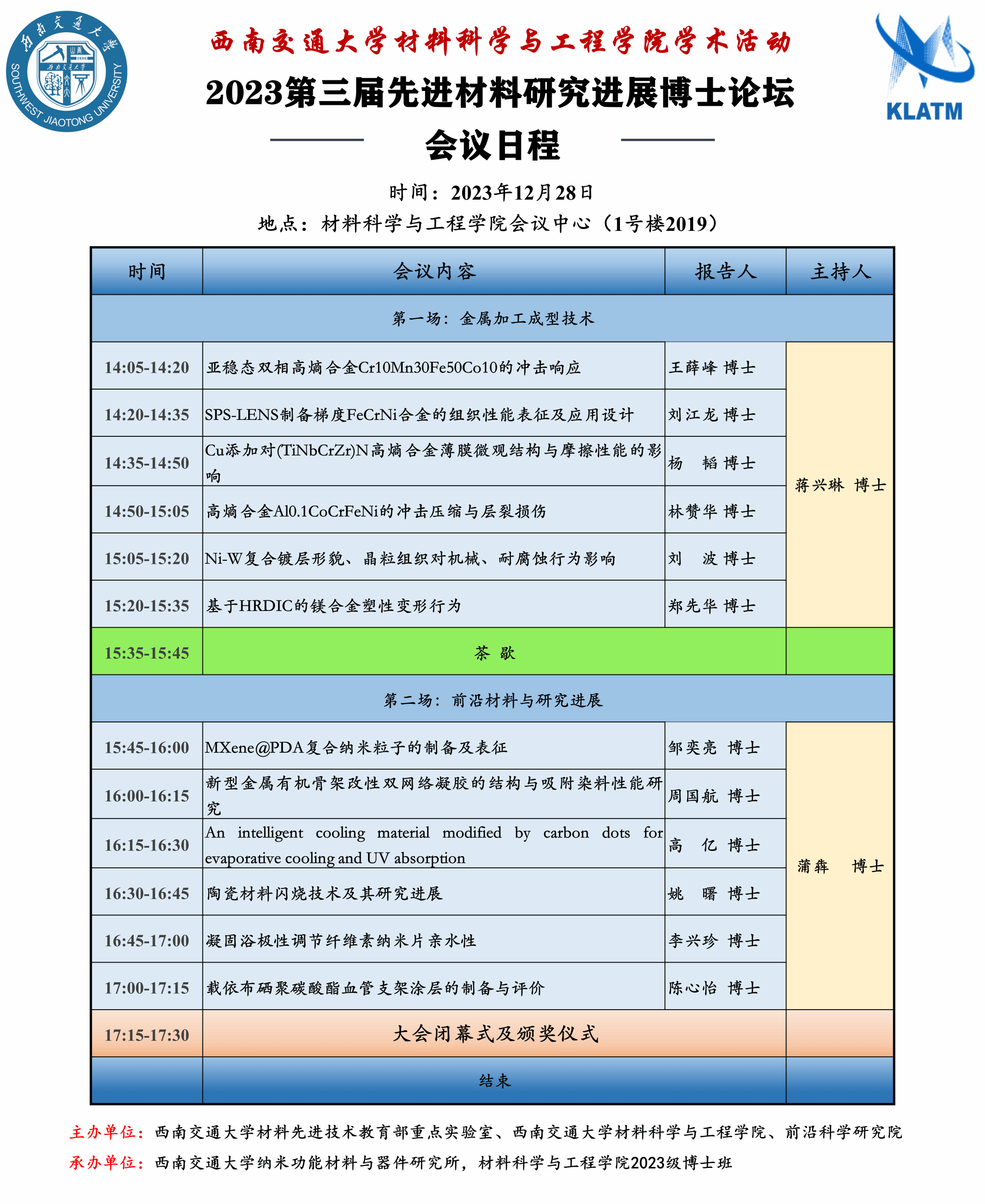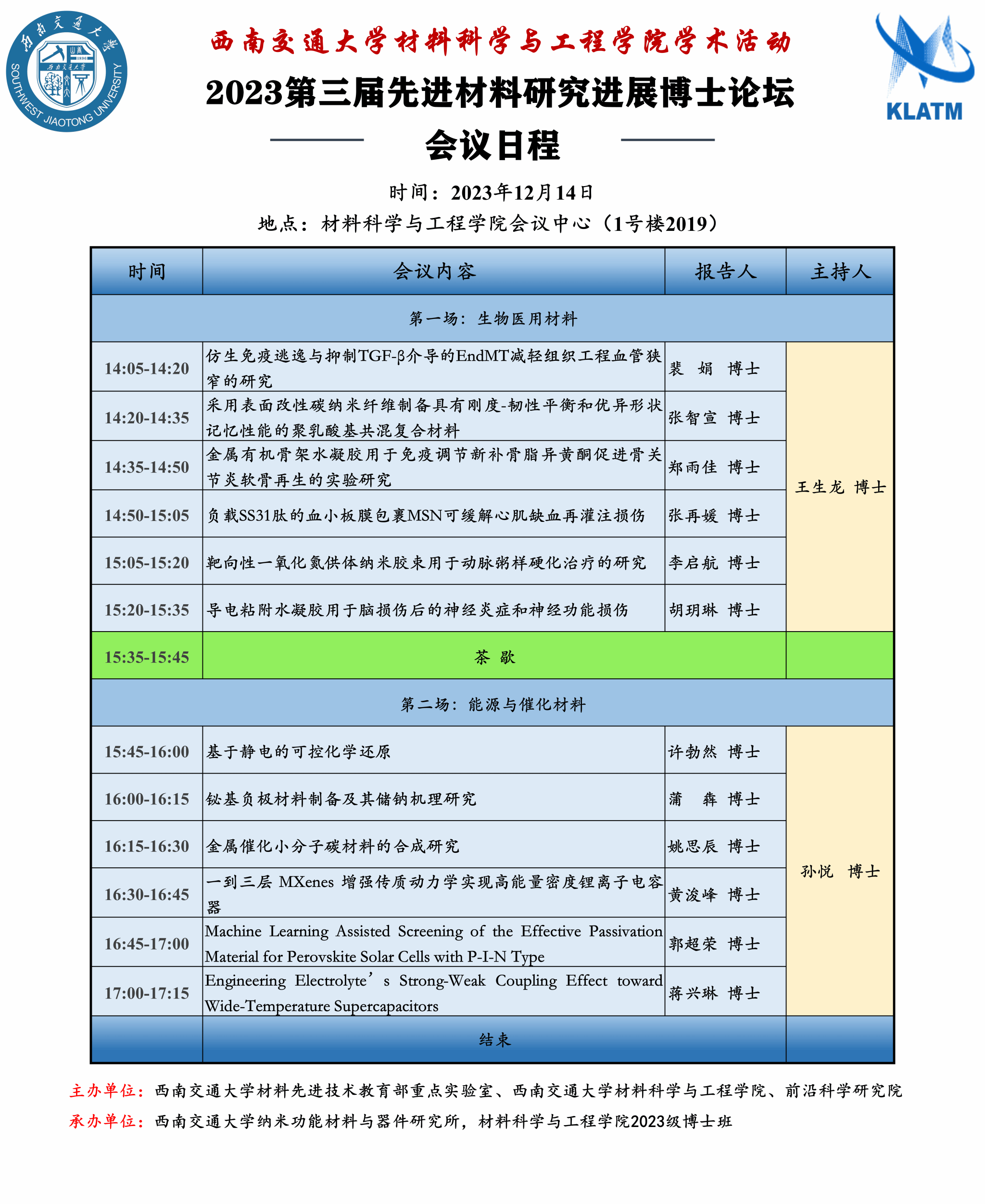 先进材料的研究对于培育经济发展新动能、获取未来竞争新优势等方面具有重大意义。新材料技术是高新技术的物质基础,为主动服务于国家发展新材料的重要战略定位,集中力量推进关键核心技术的攻关和产业创新;推进材料研究向“能源+材料”“基础+高端”方向发展,将于2023年12月7日,12月14日,12月21日,12月28号举办威廉希尔WilliamHill官方网站学术活动——2023第三届先进材料研究进展博士论坛。本次论坛分为生物医用材料,敏感材料与先进技术,能源与催化材料,功能复合材料,金属加工成型技术以及前沿材料及研究进展等六个分会场,涵盖了先进材料研究前沿的48个方向,并由2023级博士进行主题报告。希望借举行此次博士论坛的契机,为材料科研工作者提供研究工作交流的平台,吸引更多先进材料领域的老师进行指导,开启更深层次的创新合作。