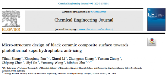 文章信息:Y. Zhang, X. Fan*, X. Li, Z. Zhang, Y. Zhang, Z. Chen, S. Ge, Y. Wang, M. Zhu*, Micro-structure design of black ceramic composite surface towards photothermal superhydrophobic anti-icing, Chemical Engineering Journal 498 (2024) 155101. https://doi.org/10.1016/j.cej.2024.155101