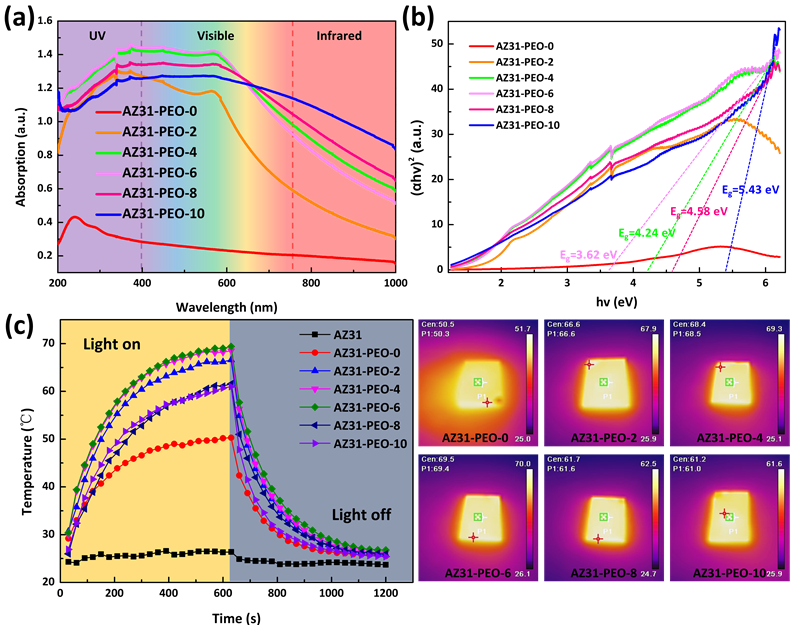 图4. (a) 不同样品的吸光度和(b) 根据吸光度用Tauc plot法计算出的禁带宽度。(c) 不同样品的光热性能测试曲线以及红外热成像光学图片。