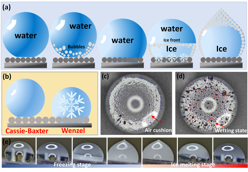 图5. (a) 光热超疏水表面动态结冰示意图,(b) Cassie-Baxter模型向Wenzel模型过渡的机理,(c) 超疏水表面水滴在未制冷情况下的俯视光学视图,(d) 开始制冷阶段,(e) 水滴在超疏水界面上的动态结冰过程和冰融化。