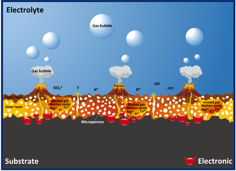图2. AZ31镁合金在电解液中的等离子电解氧化过程及黑色陶瓷多孔骨架的形成机理。(其中A4-和B6-代表铜离子的络合状态)。
