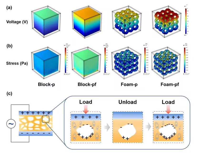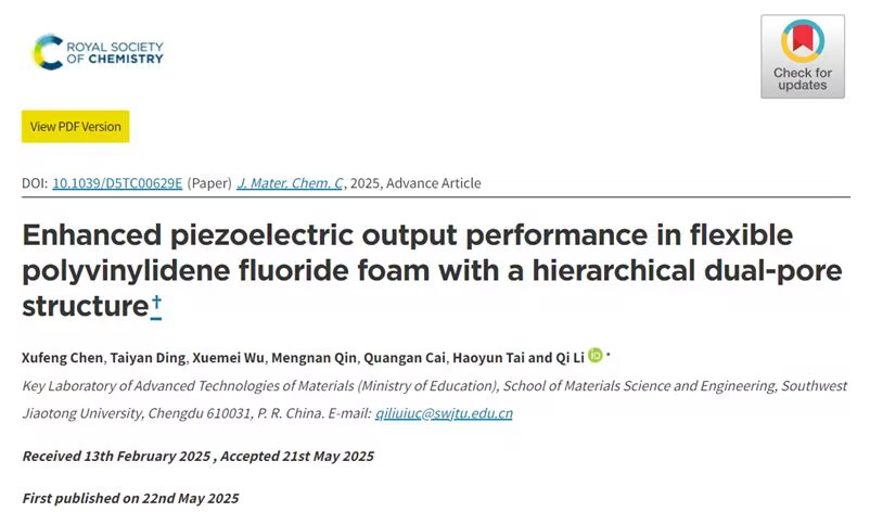 该项研究通过表征测试和有限元仿真的方法对于两类孔隙结构的性能影响机制进行探究,结果发现,三维网络孔隙结构大大降低了样品的弹性模量,不仅使样品在相同载荷下整体具有更大的压缩应变,而且应力集中点分布在内部孔壁上,比致密结构内部的最大应力高 ~ 20倍,这些位置产生了更强的结合电荷;网络状基体表面的微孔则显著增强了界面电荷极化效应,使得更多的电荷被局部捕获在样品的内表面。两类孔结构的协同机制促使器件能够产生更高效的载荷传递和信号放大,表现出比致密或单一孔样品更优异的电压输出和灵敏度。这项工作提出了一种新型的双级孔结构材料构筑策略,为压电器件材料的结构设计提供了新思路。相关研究近日以“Enhanced piezoelectric output performance in flexible polyvinylidene fluoride foam with a hierarchical dual-pore structure”为题在线发表于《Journal of Materials Chemistry C》(https://doi.org/10.1039/D5TC00629E)。西南交通大学材料学院博士研究生陈煦芬为论文第一作者,李琦教授为论文的通讯作者。该项工作得到了国家自然科学基金、四川省应用基础研究计划以及中央高校基本科研业务费等项目的支持。