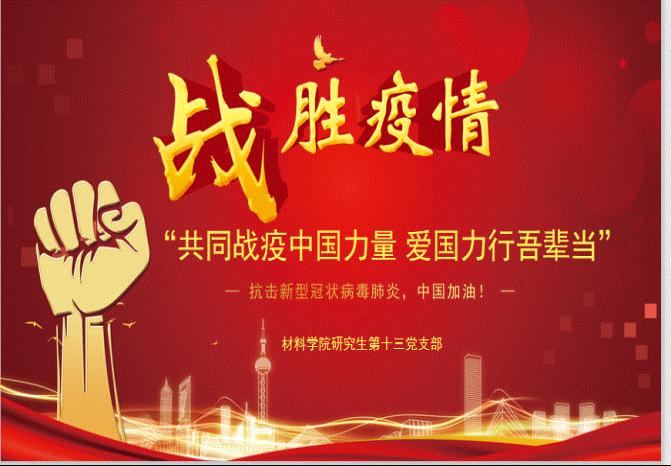 2020年3月3日晚20:00,材料学院研究生第十三党支部依托微信进行了主题为“共同战疫中国力量,爱国力行吾辈担当”的主题党日活动,会议由支部书记李婷主持。活动分为四个部分:伟大民族精神凝聚向心力、形成战斗力;在疫情防控阻击战中弘扬伟大民族精神;万众一心,坚决打赢疫情防控阻击战;总书记就抗击疫情给出了“最强攻略”。