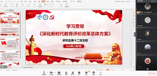 2020年11月9日晚21时15分,材料科学与工程学院研究生第十二党支部在腾讯会议组织支部党员学习讨论由中共中央、国务院印发的《深化新时代教育评价改革总体方案》(以下简称《方案》),本次学习活动由支部书记尹佳宁同志主持。