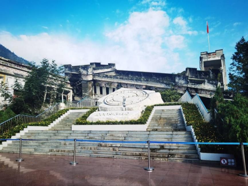 同志们首先参观了映秀漩口中学遗址。走进漩口中学遗址,第一眼看见几栋残破颓圮的楼房前那一盘白色大理石钟表雕刻表盘上的时针停留在十四时二十八分的位置。在讲解员的解说下,同志们了解到映秀在“5.12”地震中的受灾情况和灾害发生时的感人事迹。