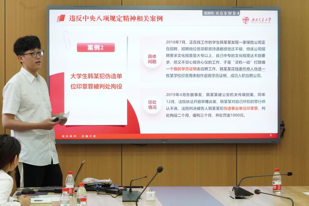 随后,本科生第二党支部书记邓思麒带领大家一同学习违反中央八项规定精神相关案例。他通过分析真实案例,警示党员们要警惕"象牙塔"里的廉洁风险。最后,他引用《中庸》中的“博学之,审问之,慎思之,明辨之,笃行之”与在座各位共勉。