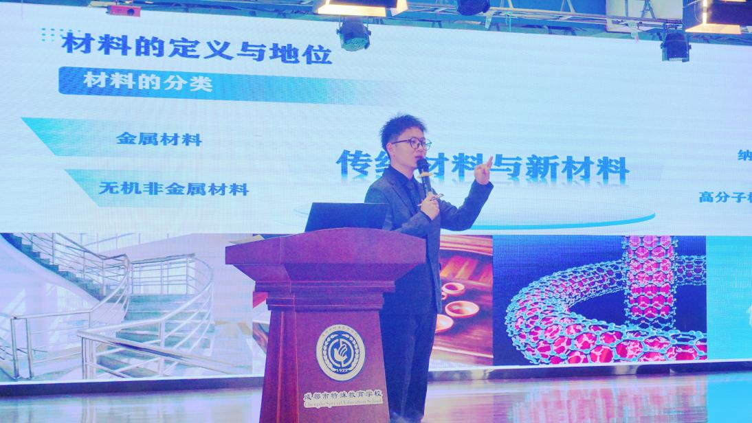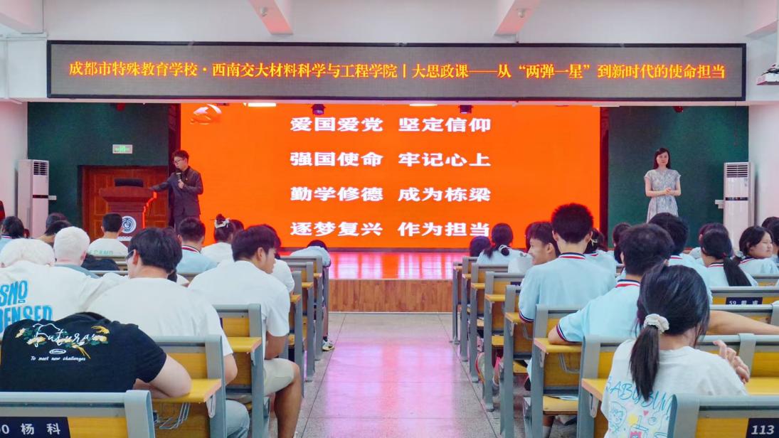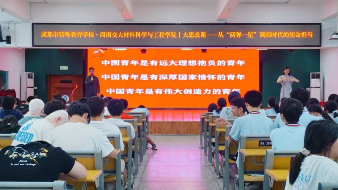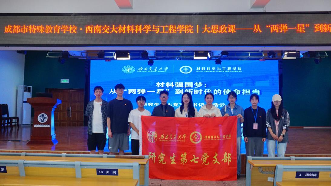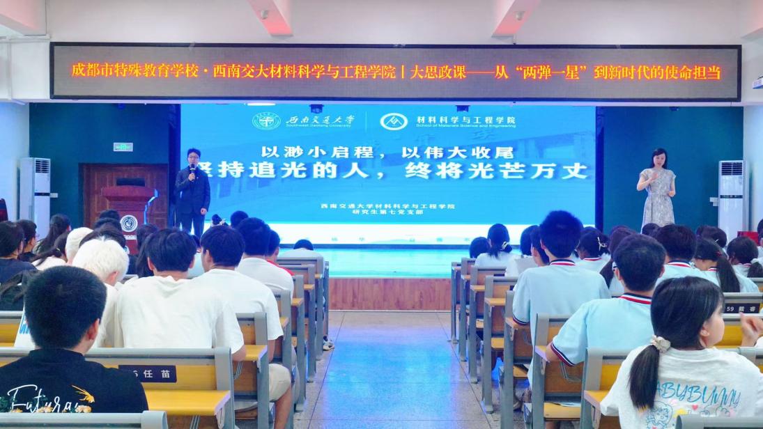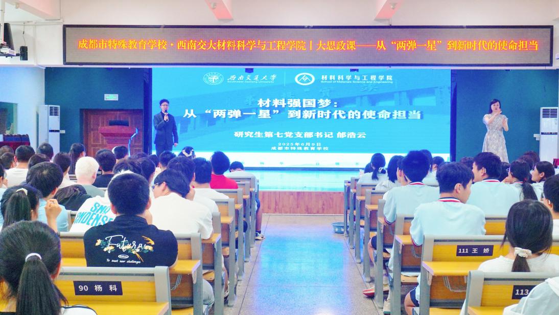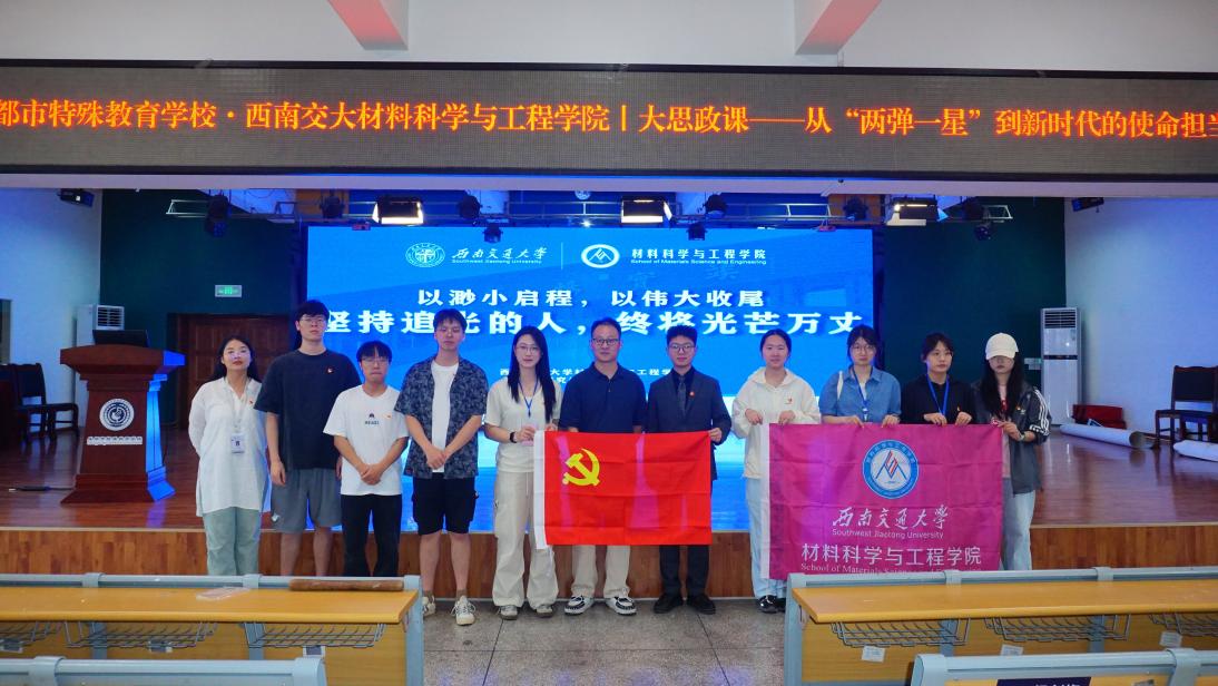 6月9日,西南交通大学材料学院研究生第七党支部走进成都市特殊教育学校开展参观交流活动。支部邰浩云为初高中部学生讲授了一堂主题为 “材料强国梦:从‘两弹一星’到新时代的使命担当” 的材料思政课,将知识传递、精神传承与使命教育相结合,为特殊教育学生带来一场别开生面的学习体验。