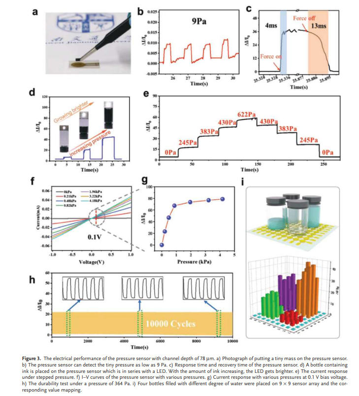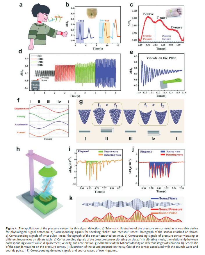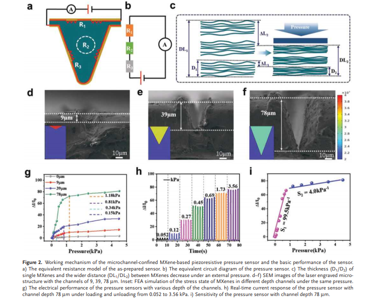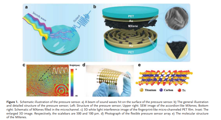 Multifunctional micro-force sensing in one device is an urgent need for the higher integration of the smaller flexible electronic device toward wearable health-monitoring equipment, intelligent robotics, and efficient human–machine interface. Herein, a novel microchannel-confined MXene based flexible piezoresistive sensor is demonstrated by the group of Prof. Yang Weiqing to simultaneously achieve multi-types micro-force sensing of pressure, sound, and acceleration. Benefiting from the synergistically confined effect of the fingerprint-micro-structured channel and the accordion-micro-structured MXene materials, the as-designed sensor remarkably endows a low detection limit of 9 Pa, a high sensitivity of 99.5 kPa−1 , and a fast response time of 4 ms, as well as non-attenuating durability over 10000 cycles. Moreover, the fabricated sensor is multifunctionally capable of sensing sounds, micromotion, and acceleration in one device. Evidently, such a multifunctional sensing characteristic can highlight the bright prospect of the microchannel-confined MXene-based micro-force sensor for the higher integration of flexible electronics. The First author of this excellent work is Gao Yuyu, and the Paper was published a 27, January, 2020.
